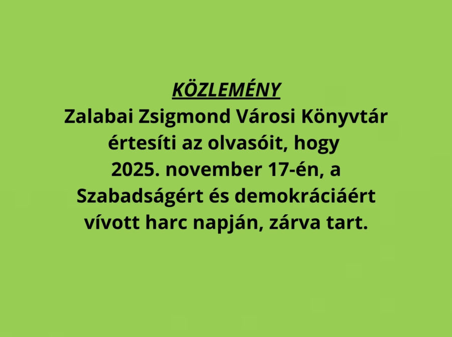 Zalabai Zsigmond Városi Könyvtár értesíti az olvasóit, hogy 2025. november 17-én, a Szabadságért és demokráciáért vívott harc napján, zárva tart.